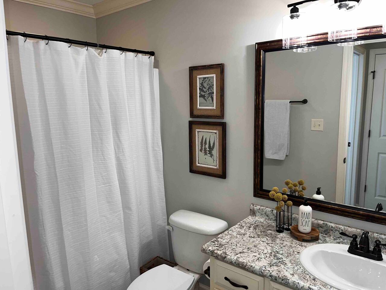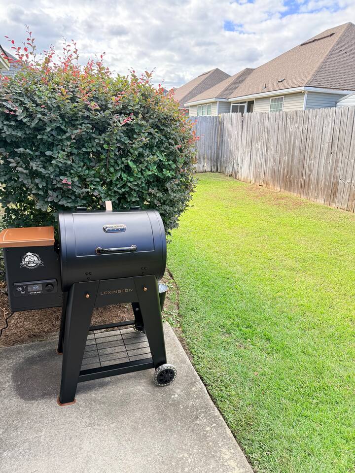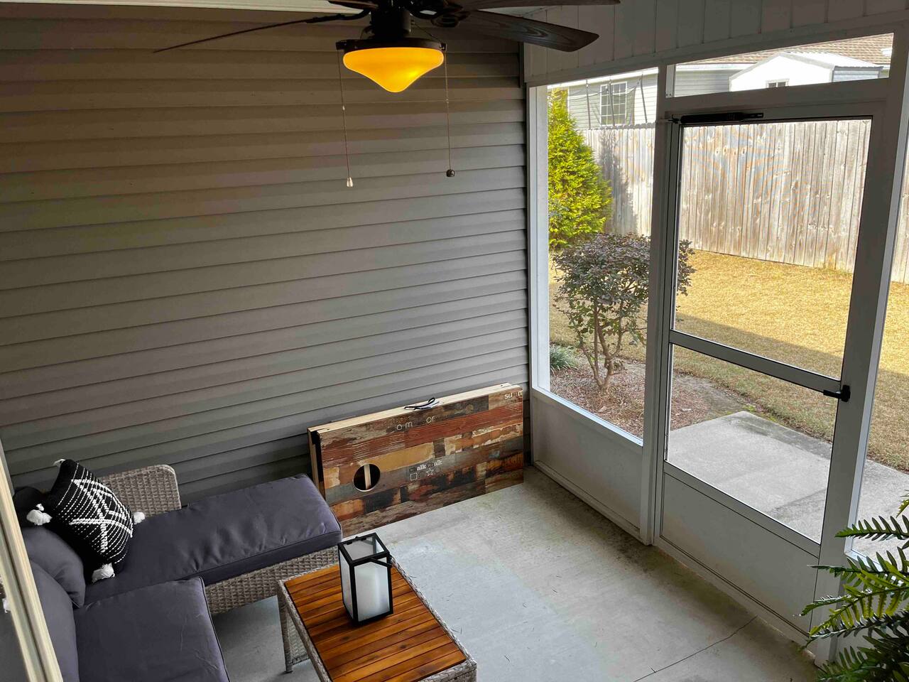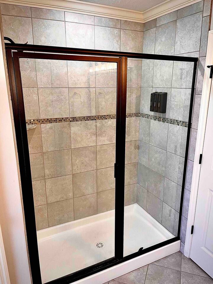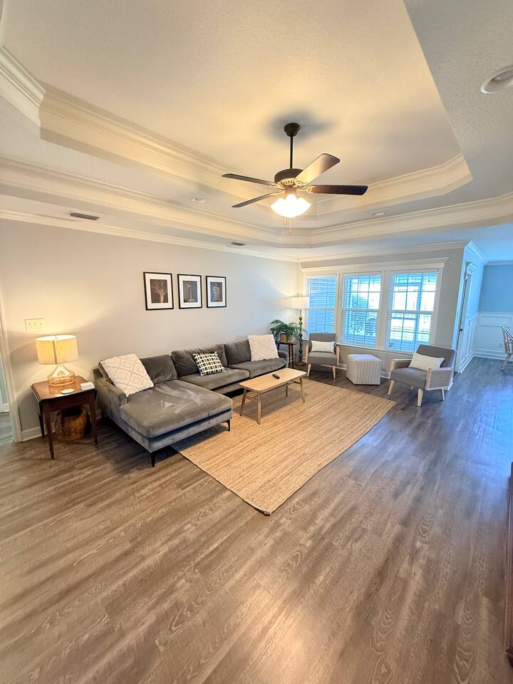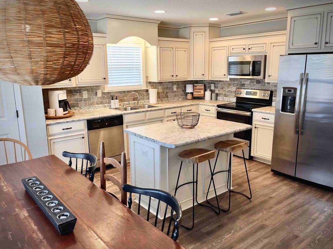 Relax in this quiet, stylish 3BR/2BA cottage with modern upgrades and TV's in every bedroom. Enjoy a spacious open living area, gourmet kitchen with large island, and a screened porch with patio and smoker BBQ. The master suite offers a soaker tub, tiled shower, and dual vanities. Includes games, a queen air mattress, and access to a 30-acre lake and playground — perfect for family getaways!