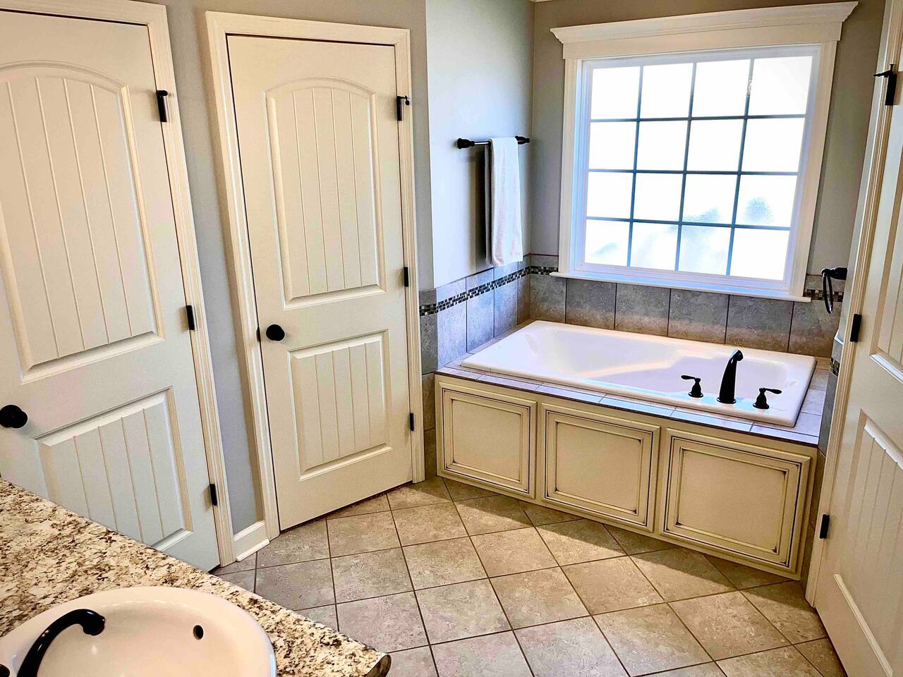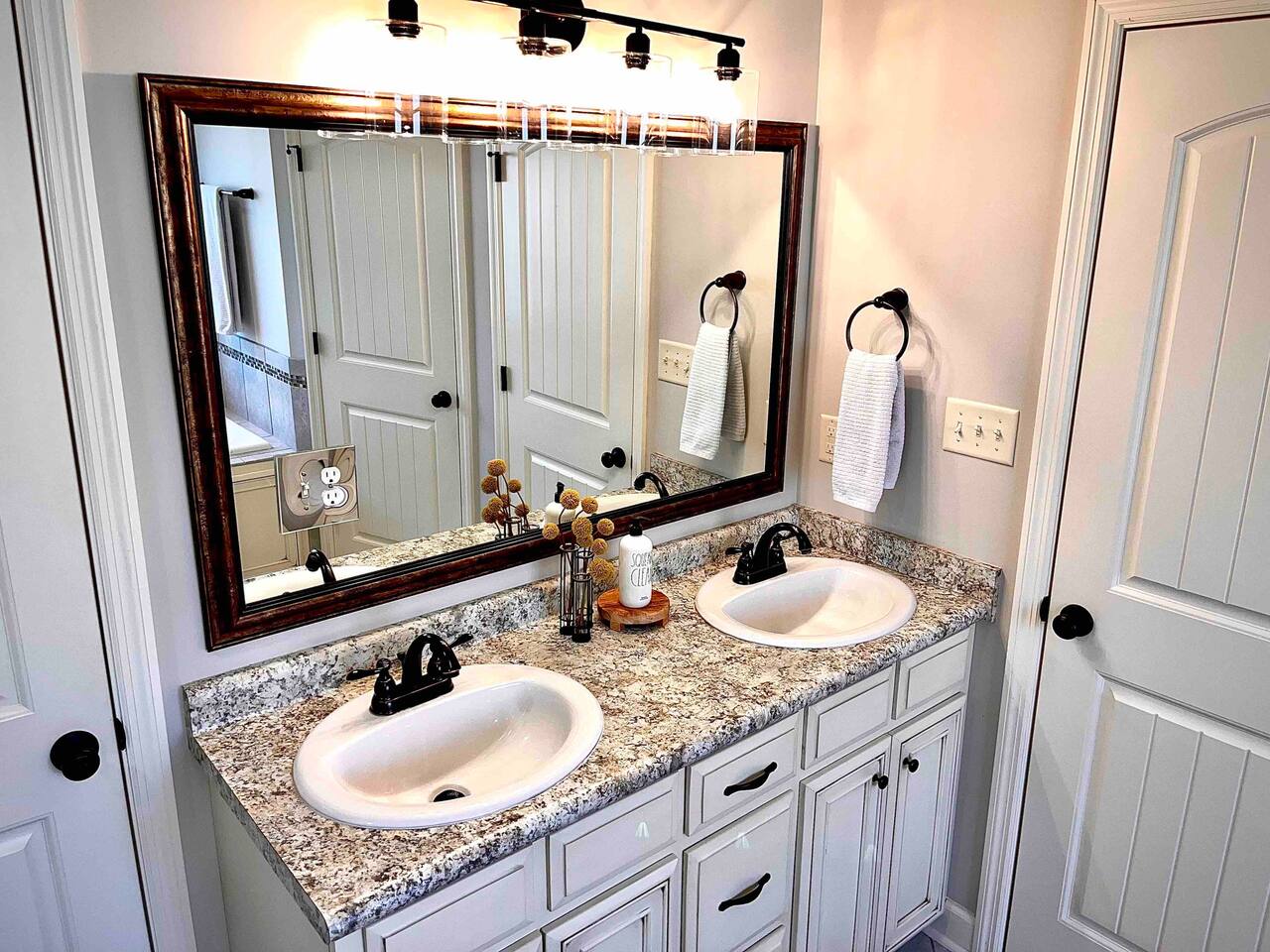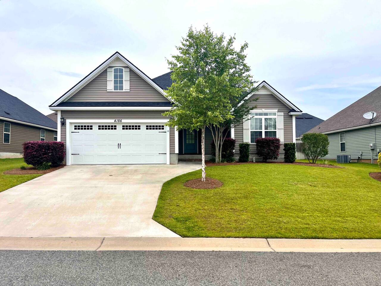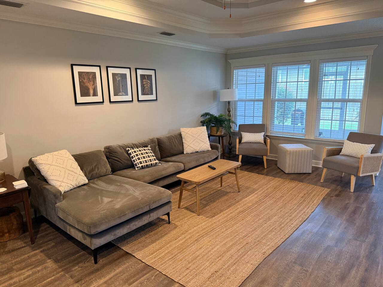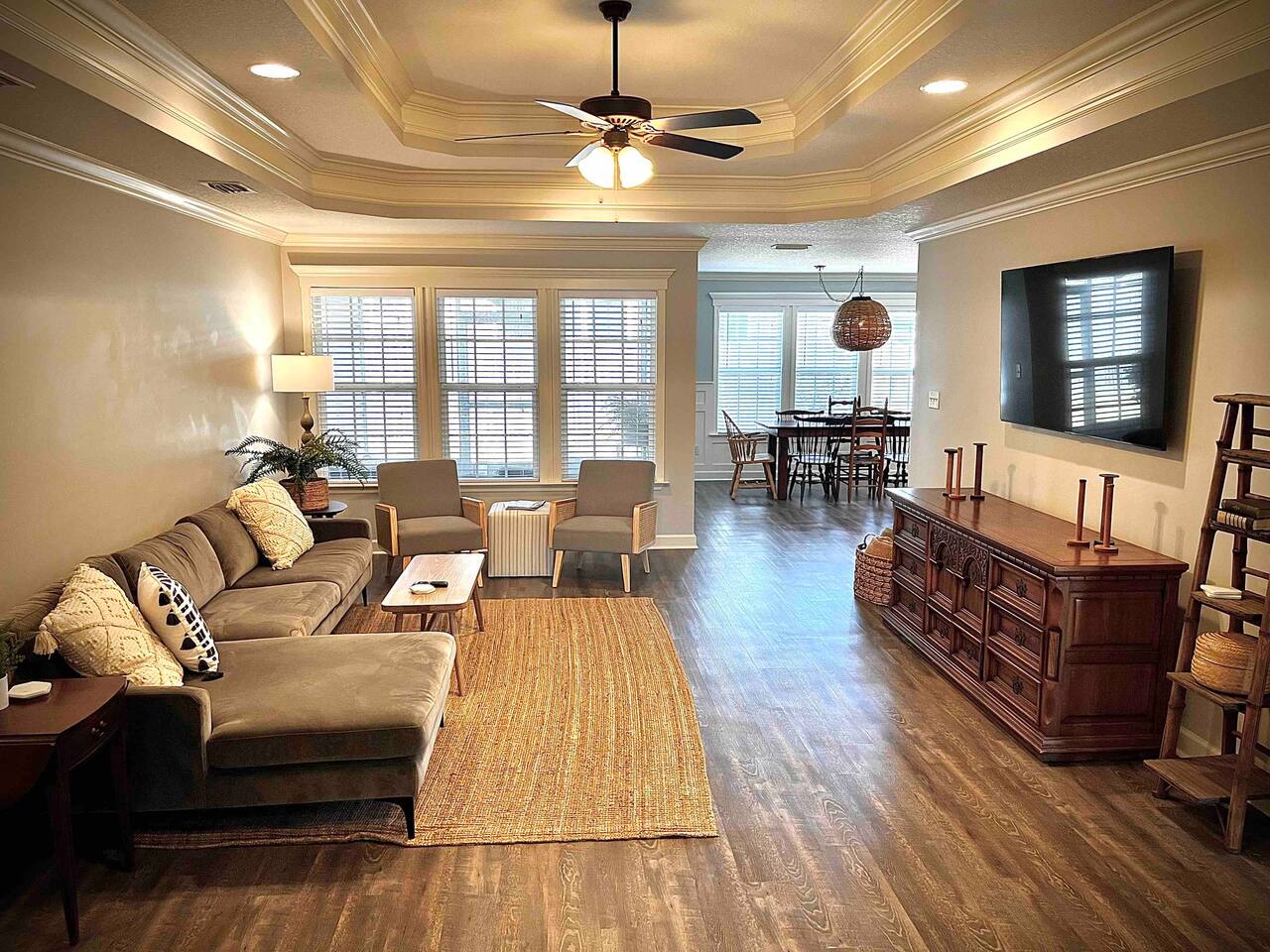 Relax in this quiet, stylish 3BR/2BA cottage with modern upgrades and TV's in every bedroom. Enjoy a spacious open living area, gourmet kitchen with large island, and a screened porch with patio and smoker BBQ. The master suite offers a soaker tub, tiled shower, and dual vanities. Includes games, a queen air mattress, and access to a 30-acre lake and playground — perfect for family getaways!